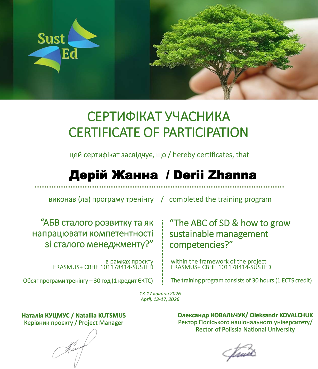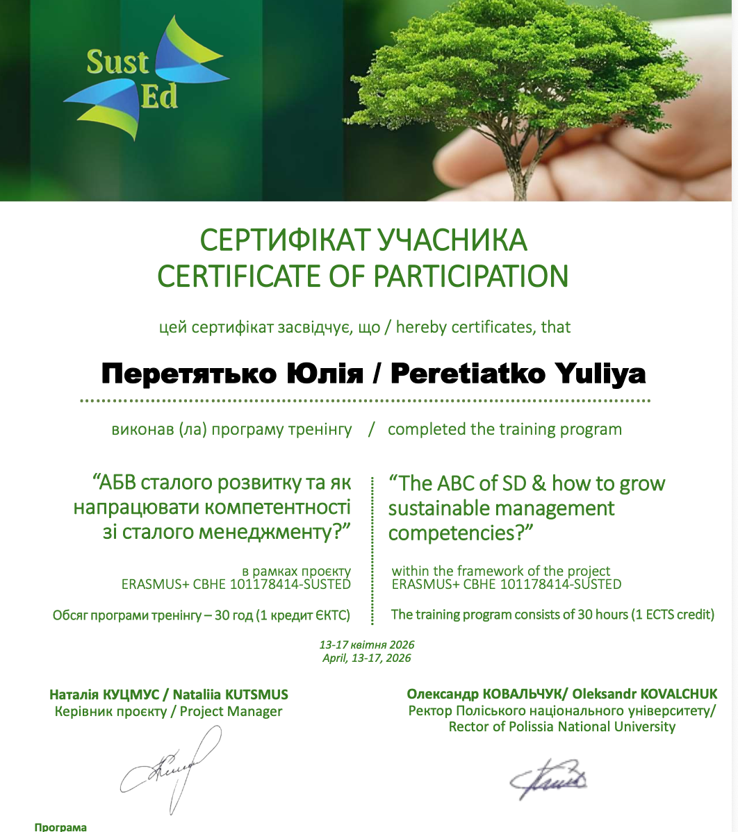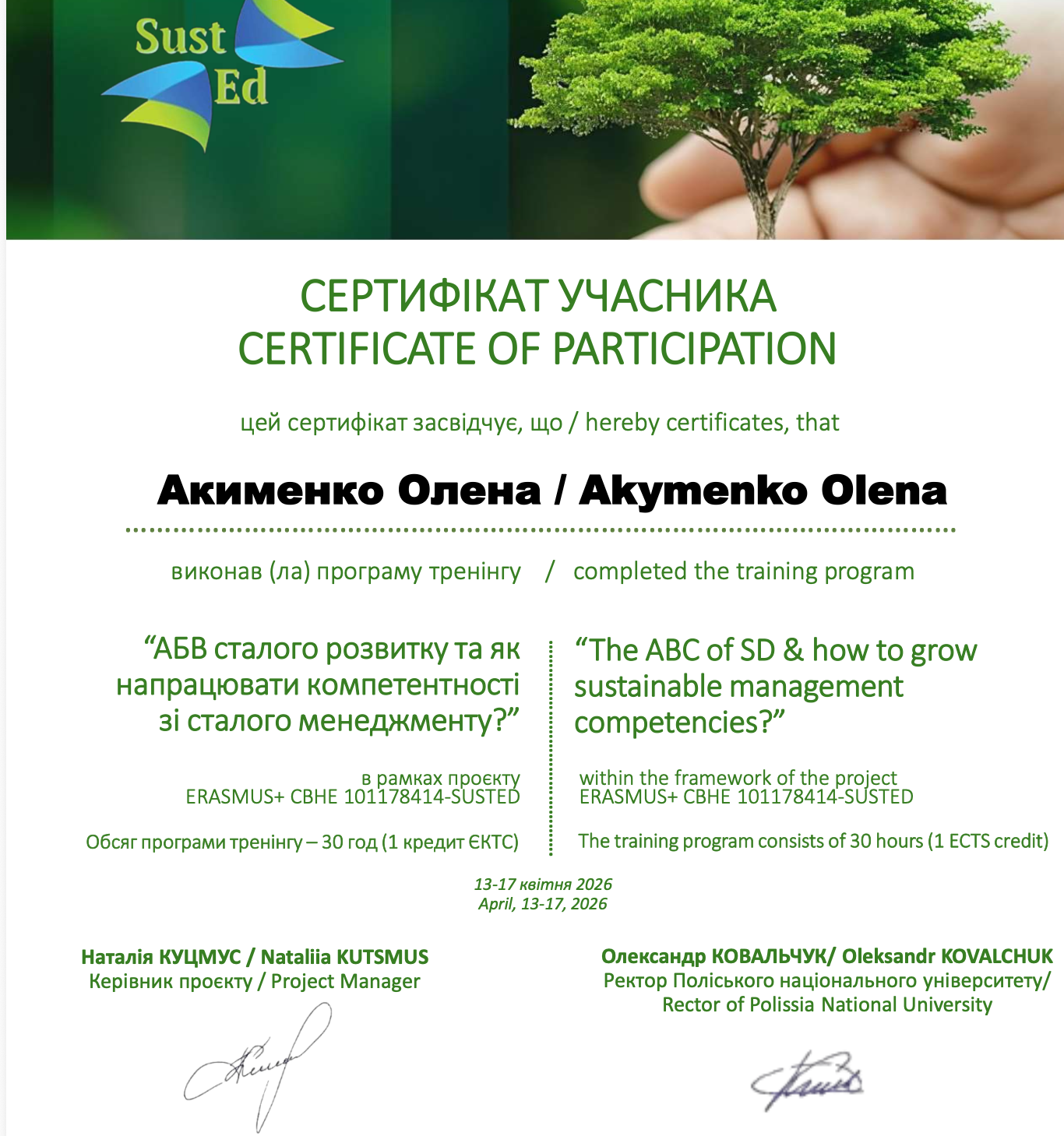 Участь в тренінгах в межах проєкту ERASMUS+ КА2 SUSTED “AБВ сталого розвитку та як напрацювати компетентності зі сталого менеджменту?”