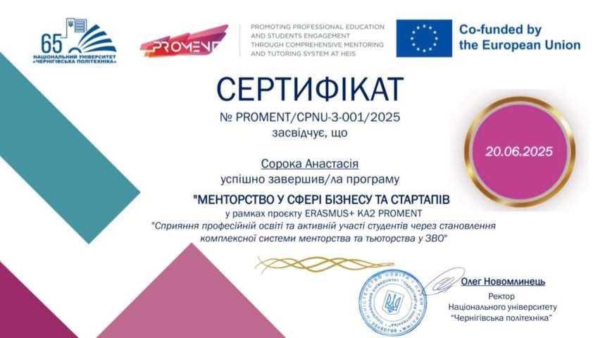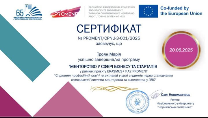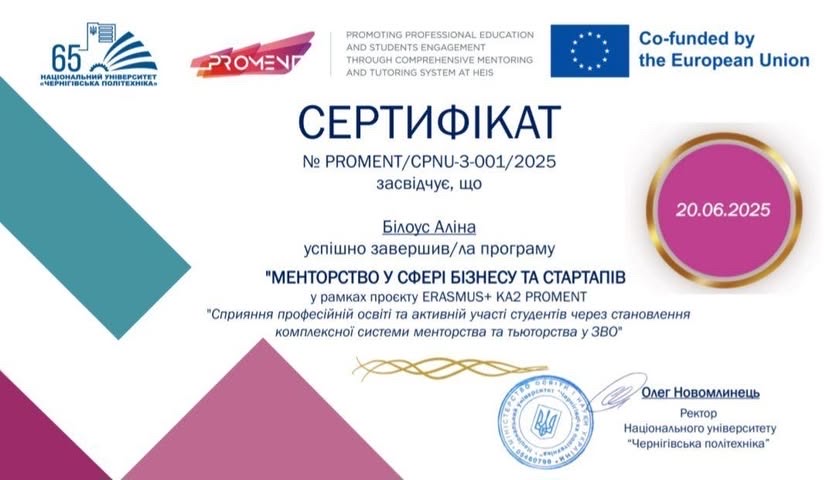 Ми щиро вітаємо наших здобувачок вищої освіти кафедри економіки, обліку і оподаткування: Бибик Вікторію, Білоус Аліну, Троян Марію, Сороку Анастасію — із успішним проходженням менторської програми “Менторство для стартапів і бізнесу” та отриманням сертифікатів випускниць.