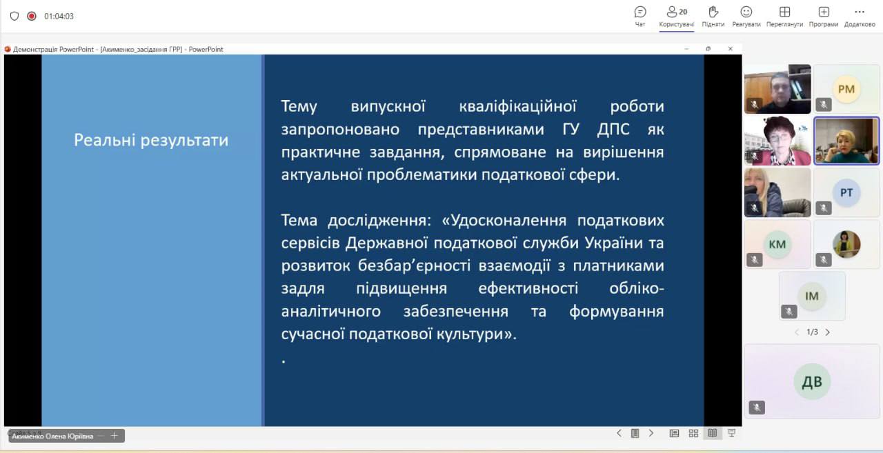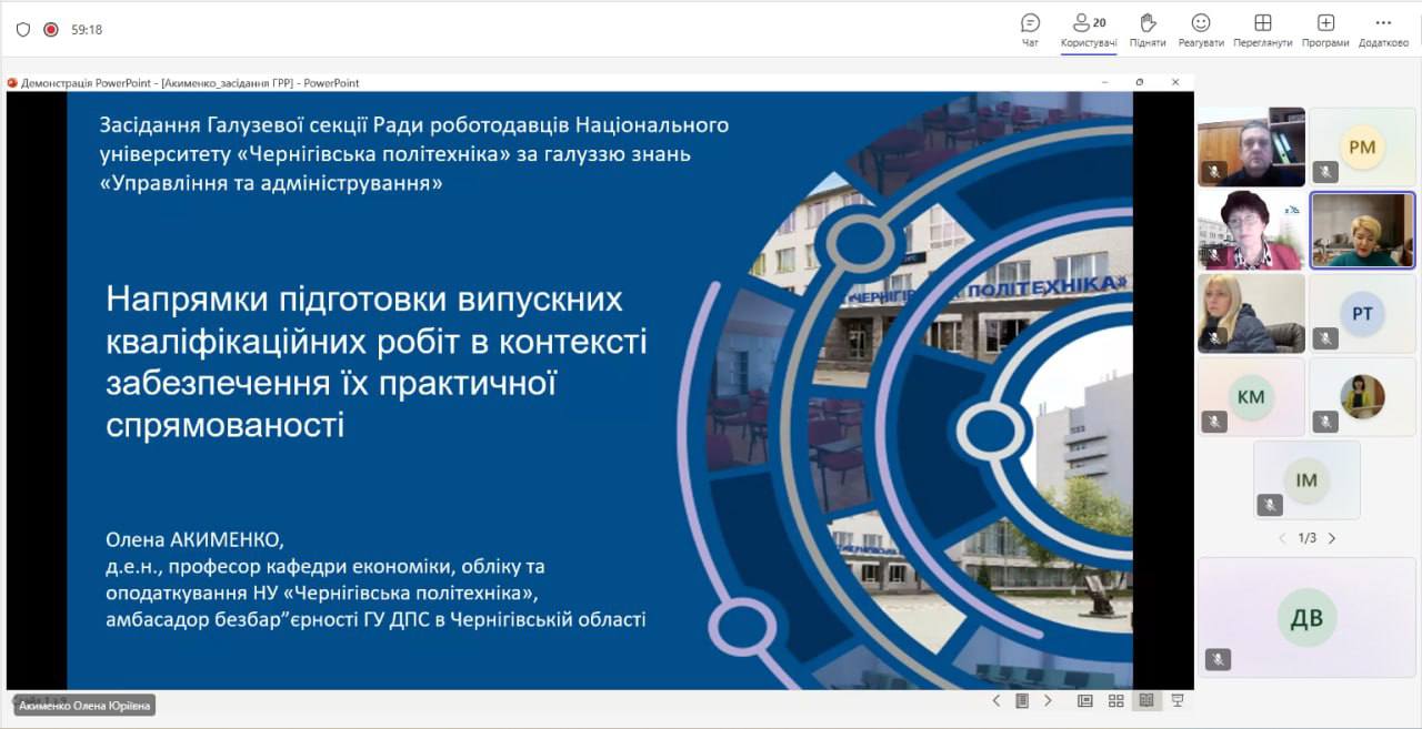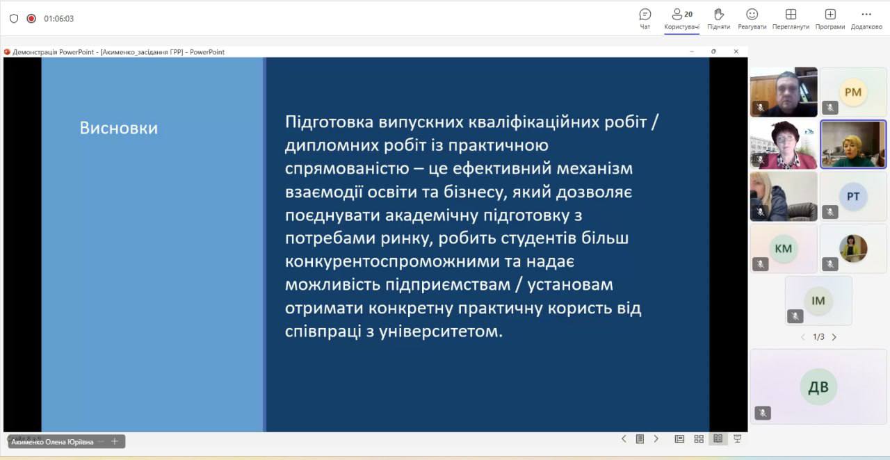 У межах засідання з доповіддю на тему «Напрями підготовки випускних кваліфікаційних робіт у контексті забезпечення їх практичної спрямованості» виступила Акименко О.Ю., д.е.н., професор, амбасадор безбар’єрності ГУ ДПС у Чернігівській області. У своєму виступі вона акцентувала увагу на важливості інтеграції практикоорієнтованих завдань у тематику кваліфікаційних досліджень, що дозволяє забезпечити відповідність змісту освітніх програм сучасним потребам бізнесу та державних установ. Окремо було підкреслено значення партнерської взаємодії між університетом та роботодавцями для формування високорівневої професійної підготовки здобувачів, здатних ефективно працювати в умовах динамічних економічних змін.