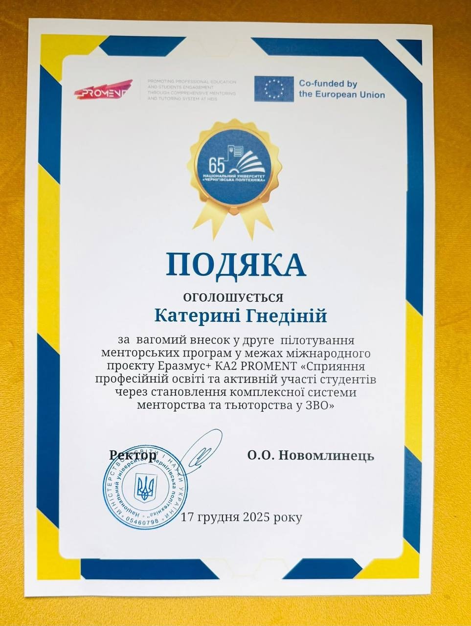 За вагомий внесок у друге пілотування менторських програм у межах міжнародного проєкту Erasmus+ KA2 PROMENT «Сприяння професійній освіті та активній участі студентів через становлення комплексної системи менторства та тьюторства у ЗВО» Гнедіна Катерина Володимирівна відзначена Подякою від ректора НУ «Чернігівська політехніка» О.О. Новомлинця. Здобувачки вищої освіти Сорока Анастасія, Бибик Вікторія та Білоус Аліна нагороджені Грамотами за активну участь у менторських програмах міжнародного проєкту Erasmus+ KA2 PROMENT.