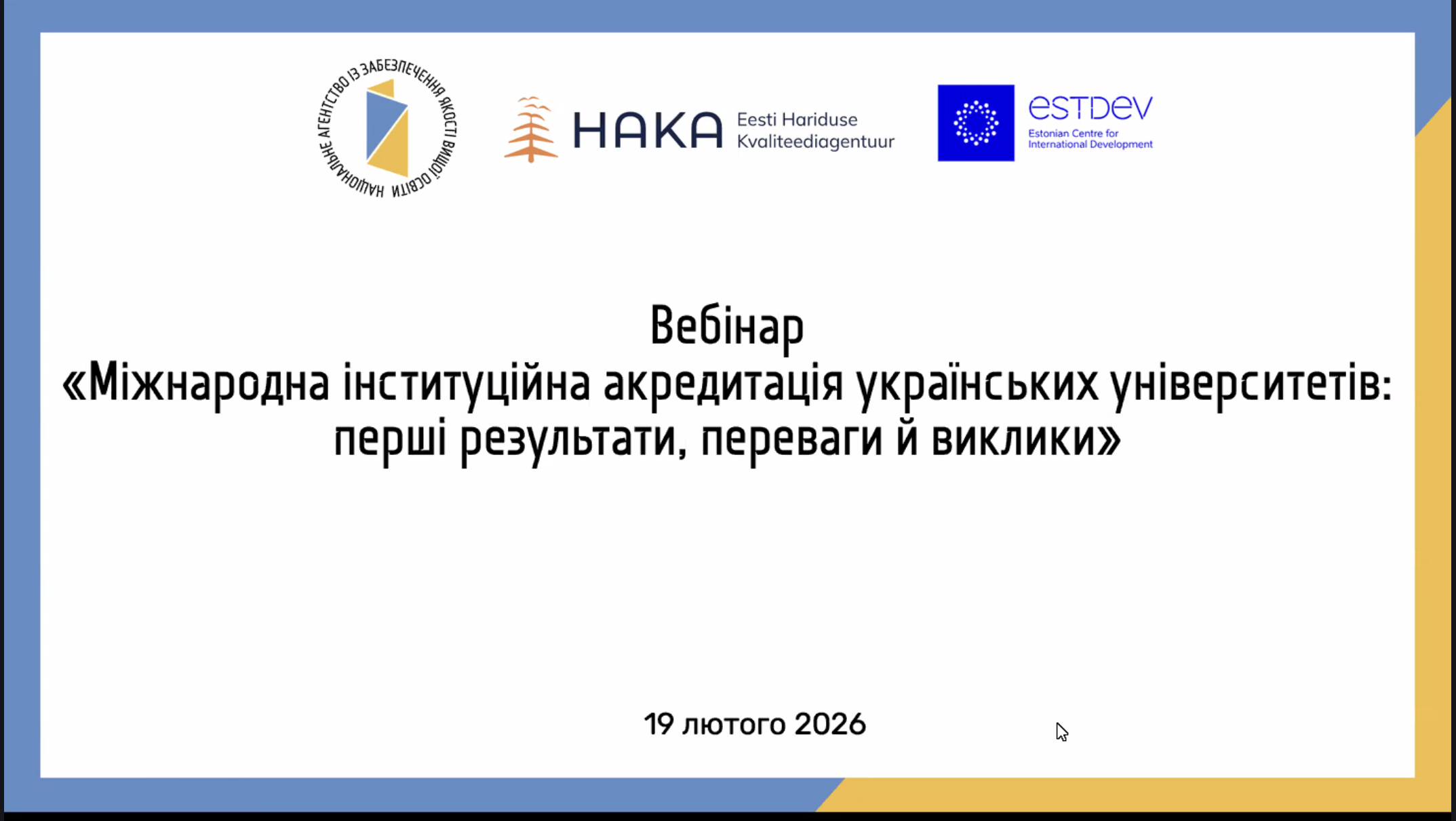 19 лютого 2026 року Ю.М. Перетятько брала участь у вебінарі «Міжнародна інституційна акредитація українських університетів: перші результати, переваги й виклики», організований у межах спільного проєкту Національного агентства із забезпечення якості вищої освіти та Eesti Hariduse Kvaliteediagentuur - HAKA (Естонського агентства якості освіти (HAKA) за підтримки Estonian Centre for International Development.