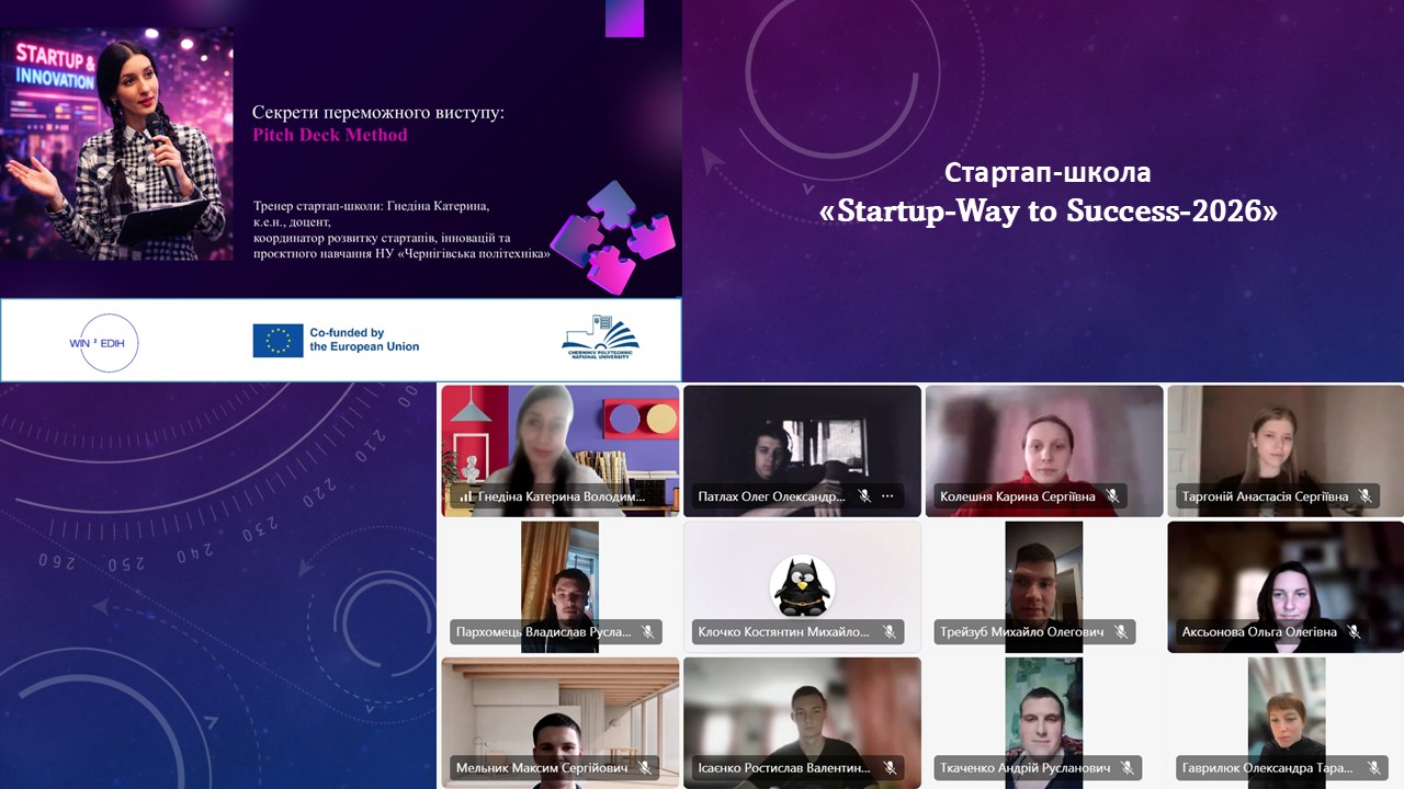 20 березня 2026 року у Національному університеті «Чернігівська політехніка» відбулося практичне заняття в межах стартап-школи «Startup-Way to Success-2026», до якого долучилися здобувачі вищої освіти спеціальностей «Економіка» та «Облік і оподаткування» (зокрема, Потапенко Оксана (гр. МОА-251), Крисковець Максим (гр.ОА-251), Трейзуб Михайло (гр. ОА-241), Ісаєнко Ростислав (гр. ОА-241), Вікторія Бибик (гр. ЕК-221), Аліна Білоус (гр. ОА-221)).