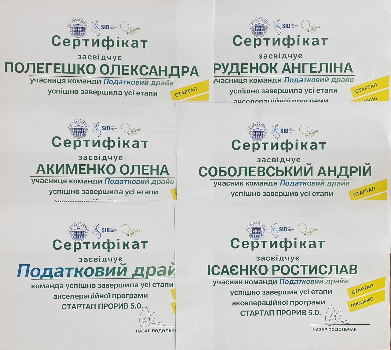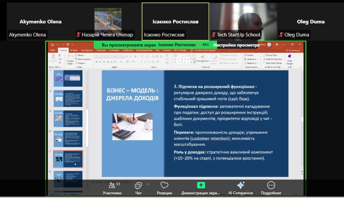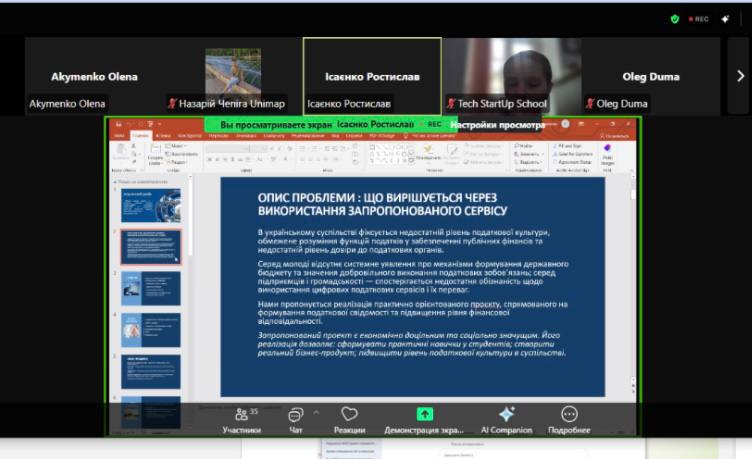 Команда «Податковий драйв», яку представляють здобувачі другого курсу спеціальності «Облік і оподаткування» ННІ бізнесу, економіки та адміністрування НУ «Чернігівська політехніка» — Ісаєнко Ростислав (капітан), Полегешко Олександра (голова студради ННІ БЕА), Рудник Ангеліна та Соболевський Андрій, — долучилася до акселераційної програми «Стартап Прорив 5.0», організованій Tech StartUp School, НУ «Львівська політехніка».